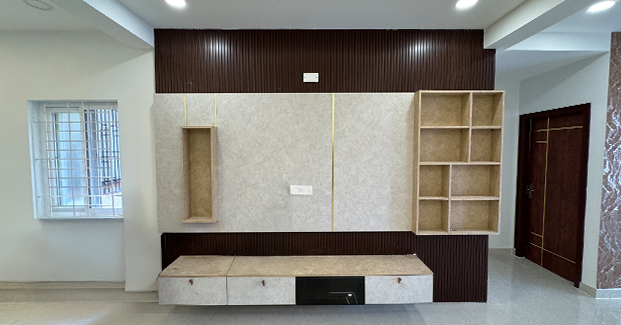 - A TV unit designed with low lying cabinet finished in wood and white laminate has open shelves on one side to showcase your books and decor.