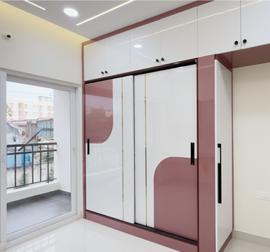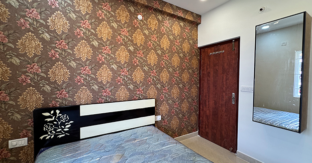 - A wardrobe with sliding doors and attached mirror in the bedroom saves space while the pullout drawers provide adequae storage for neat organisation.