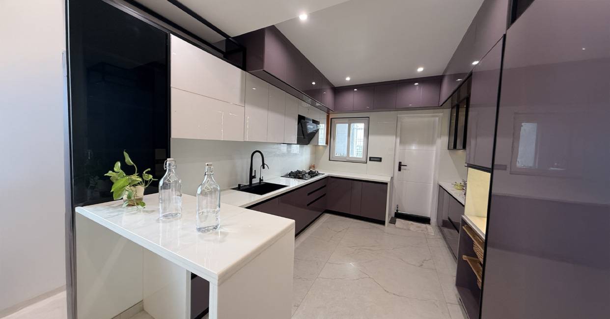 - A sleek L shaped kitchen in a dual colour tone with hexagonal tiled backsplash, handleless base and overhead cabinets finished in high gloss laminate make it functional and pretty.